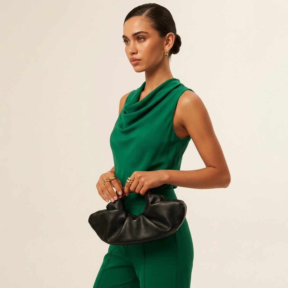 Nori – Vegan Leather Ruched Clutch Bag with Gold Ring Handle