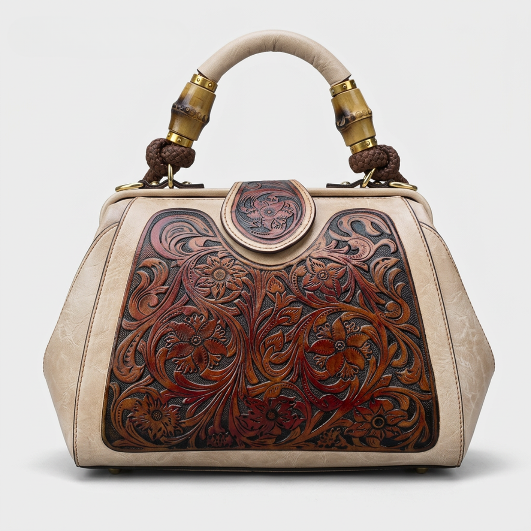 Flora – Tooled Leather Doctor Bag, Top Handle Satchel Purse