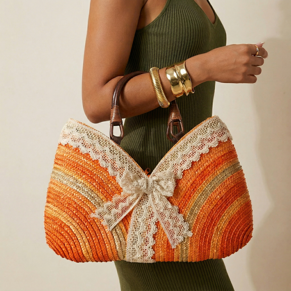 Soleil – Striped Straw Handbag with Lace Bow and Rattan Handles