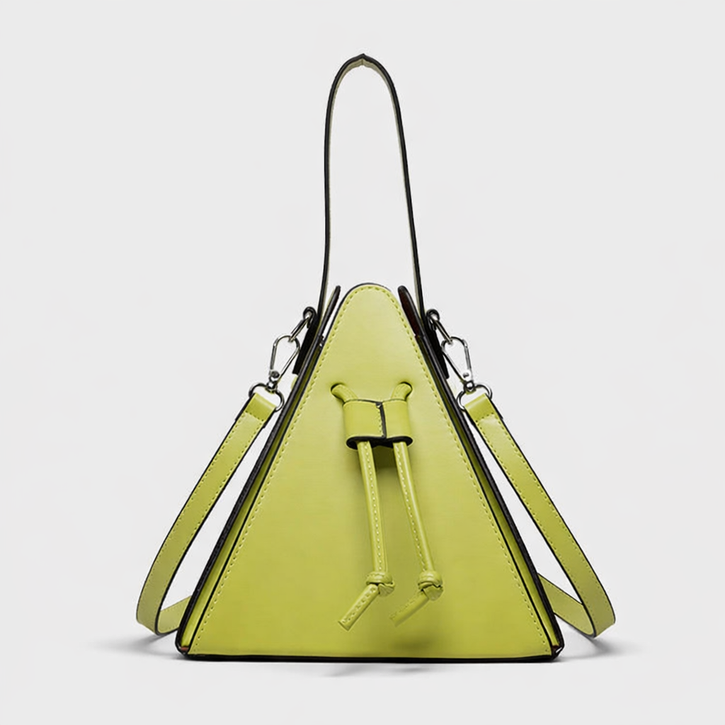 For the woman who sees her bag as a statement, the Prism delivers. Its bold triangular silhouette is a real conversation starter — geometric, sculptural, and thoroughly modern, yet compact enough for everyday carry. Clean panel design, contrast edge piping, and a front drawstring toggle give it a minimalist handbag energy that pairs naturally with casual separates, a blazer, or a monochromatic outfit. Wear it by the top handle for a sleek handheld look, or clip on the shoulder strap and go.