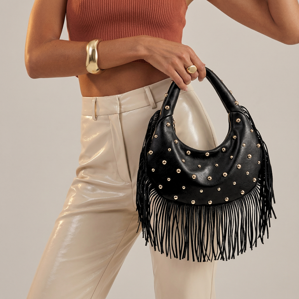 Roca – Studded Fringe Hobo Bag, Vegan Cowhide Shoulder Bag