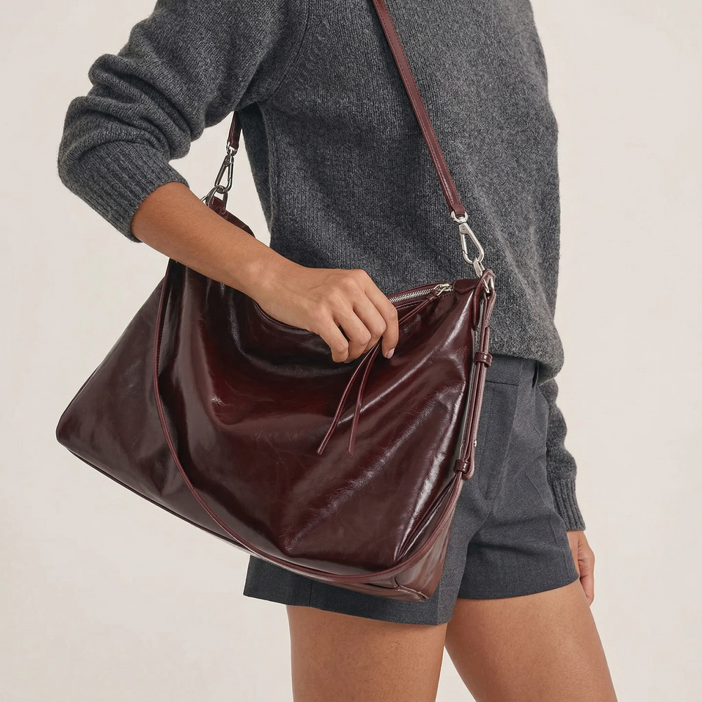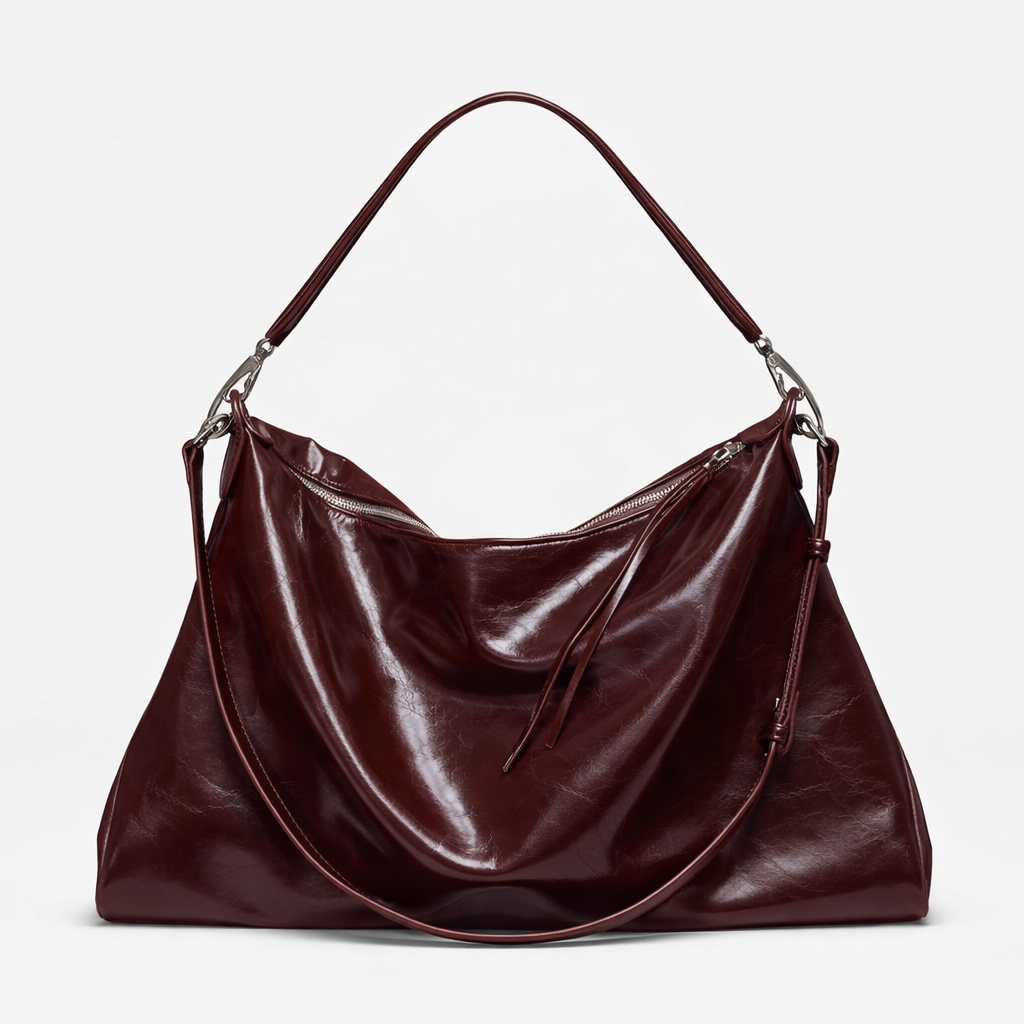 Vela – Large Glossy Vegan Cowhide Hobo Bag, Slouchy Shoulder Bag